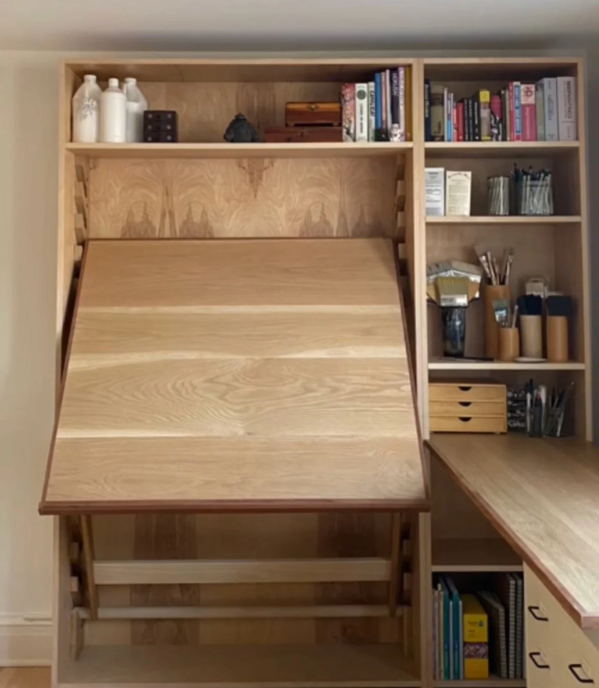 Form and Function.This was a design collaboration with a good friend and talented artist. She needed an adjustable art desk that could also have storage and a side table. This was such a joy to build!
